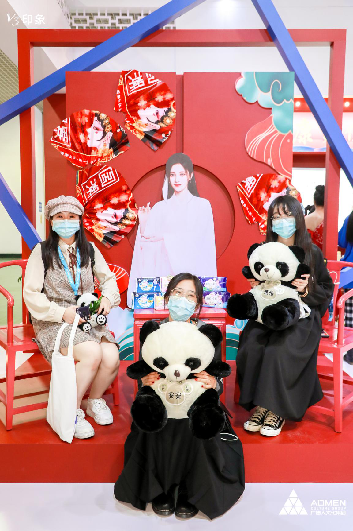 红蓝集团展位的正红布景极具特色,吸引了众多国风爱好者前来打卡,不少汉服小仙女都被熊猫玩偶萌翻了,纷纷合影留念。